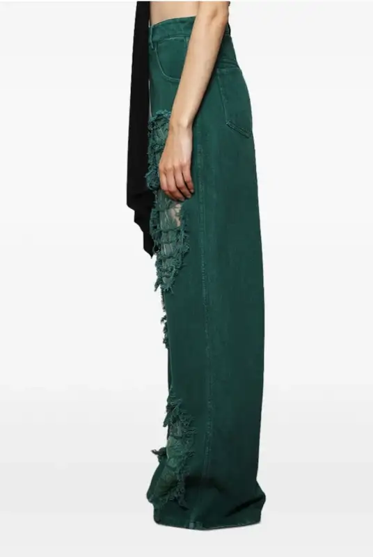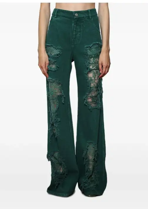 Arboreal Lace-Detailed Distressed Stretch Jeans green